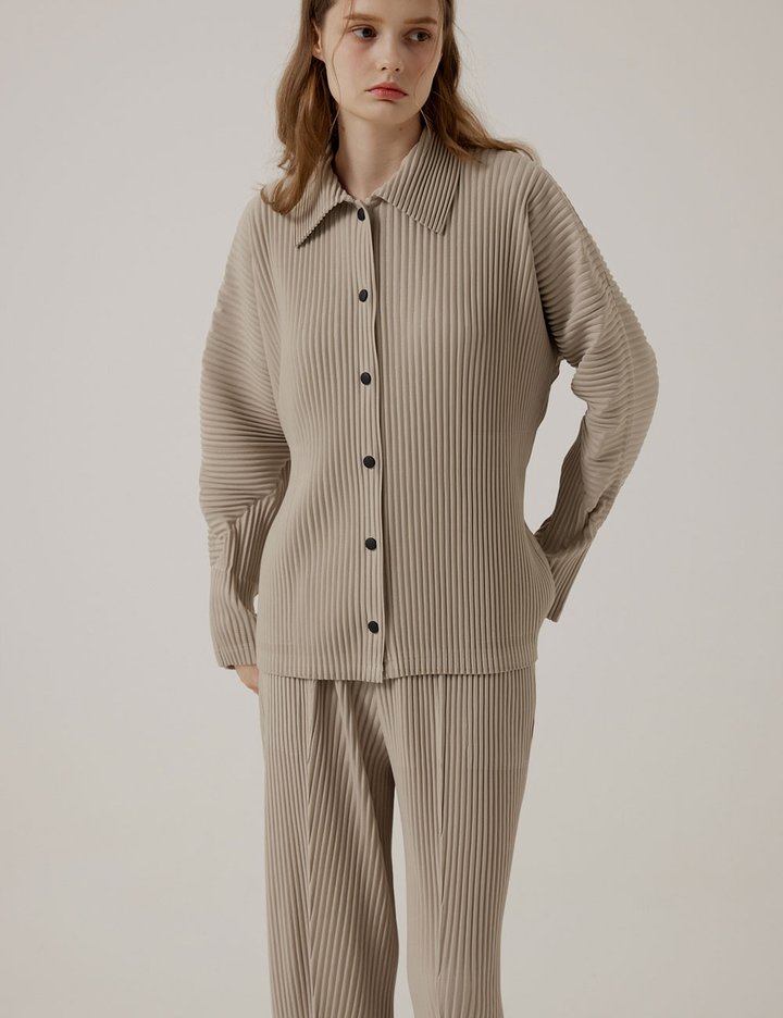 [몽플리쎄] 공용 긴소매 카라넥 스냅 버튼 플리츠 자켓 (라이트 베이지)