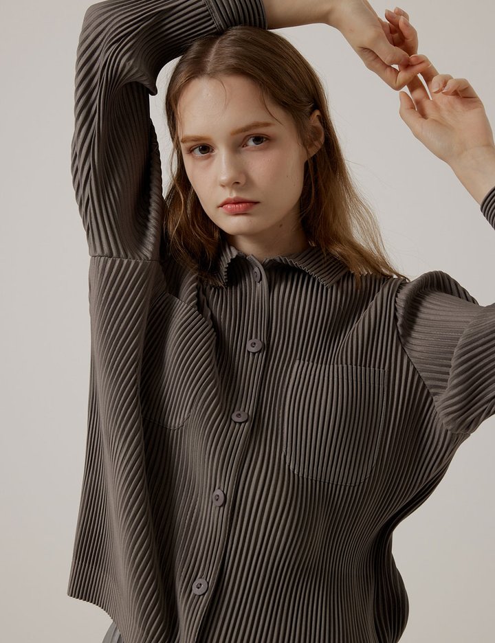 [몽플리쎄] 공용 긴소매 카라넥 풀오픈 타입 플리츠 자켓 (그레이)