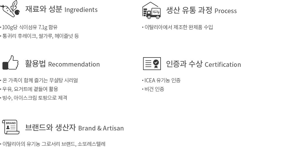 이탈리아의 유기농 그로서리 브랜드, 소또레스텔레의 유기농 고식이섬유 후르츠 뮤즐리를 만나 보세요. 유기농 통귀리 후레이크와 헤이즐넛, 블루베리, 라즈베리 등을 배합하여 고소하면서도 산뜻하게 완성했답니다. 식이섬유를 풍부하게 함유하고 있어 더욱 만족스러워요. 유기농 및 비건 인증까지 받았으니, 온 가족이 함께 즐기는 시리얼로 추천해 드릴게요. 우유, 요거트와 드시거나 빙수, 아이스크림의 토핑으로 활용해 보세요.