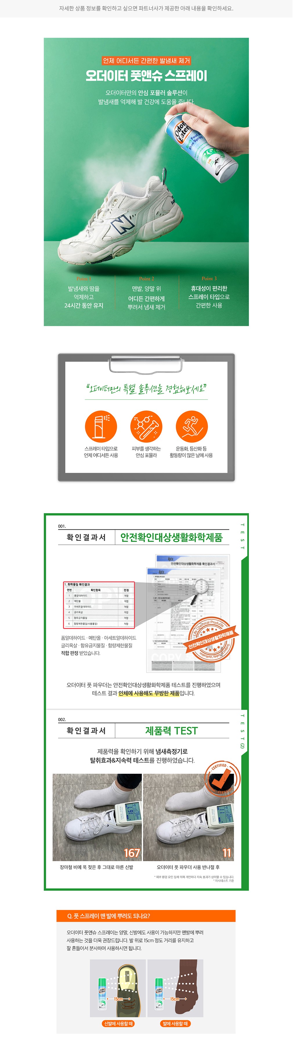 사용법 ・ 제품을 잘 흔들어준 뒤, 신발이나 양말, 맨발에 15cm 정도 거리를 두고 골고루 분사하세요.