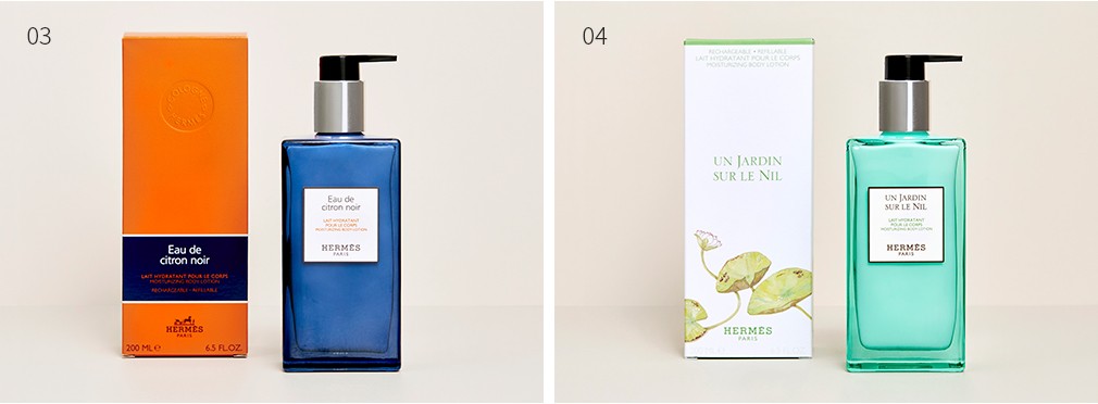 지속가능한 오브제 이번 바디 컬렉션에서 에르메스는 지속가능성에 대해 이야기합니다. 보틀은 재활용 유리로 제작되었으며, 여러 번 리필해서 재사용이 가능하죠. 컬러풀한 색감과 직선 실루엣의 보틀도 눈에 띄는데요. 보틀의 바닥을 장식하고 있는 선명한 H 모티브와, 캡 상단에 더해진 클루 드 셀(Clou de Selle) 실링까지. 곳곳에 자리한 정교하고 섬세한 디테일을 발견해보세요.