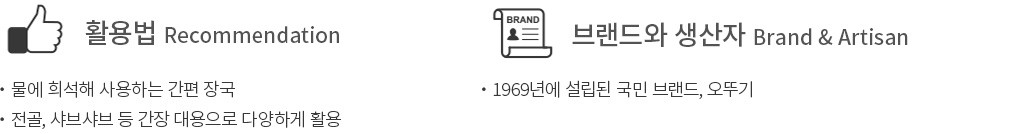 시원하고 깔끔한 국물 맛을 내고 싶을 때 오뚜기의 가쓰오부시장국을 활용해보세요. 가다랑어 포의 진한 감칠맛과 훈연 향으로 손쉽게 깊은 맛의 국물 요리를 완성해 주지요. 소량으로도 깊은 풍미를 느낄 수 있도록 8배 농축했으니, 물에 희석해 우동, 어묵탕 등으로 즐겨보세요.