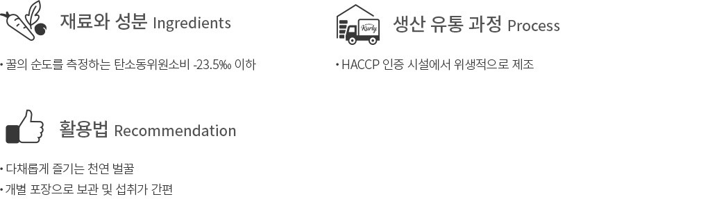・특징 : 아카시아, 피나무, 때죽나무 등 5가지 종류의 천연 벌꿀을 함께 담았습니다. 자세한 특징은 Kurly’s Tip에서 확인해 보세요.