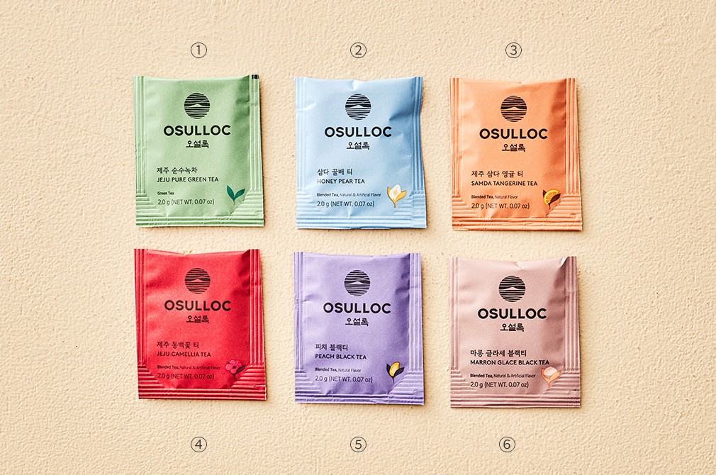 티 베리에이션 ・구성 : ①제주 순수녹차, ②삼다 꿀배 티, ③제주 삼다 영귤 티, ④제주 동백꽃 티, ⑤피치 블랙티, ⑥마롱 글라세 블랙티 각 6개입