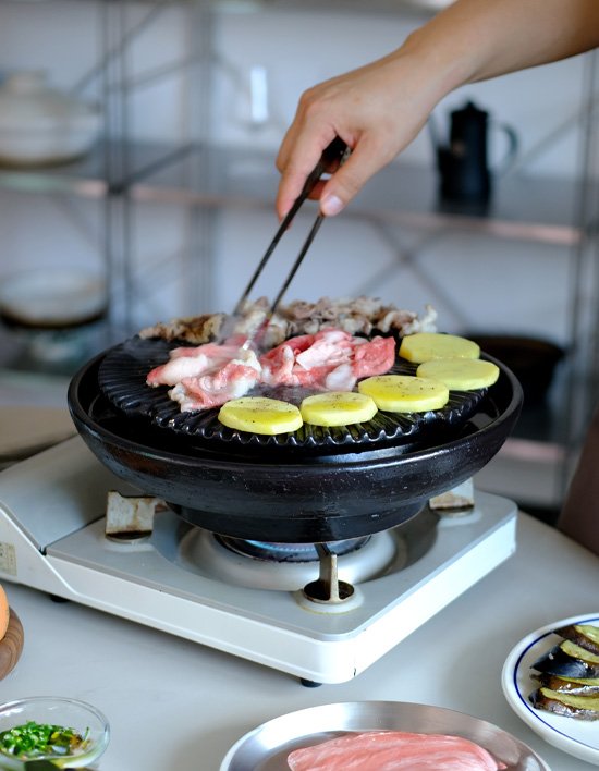 고기, 해산물, 야채를 테이블에서 맛있게 구울 수 있는 도자기 그릴