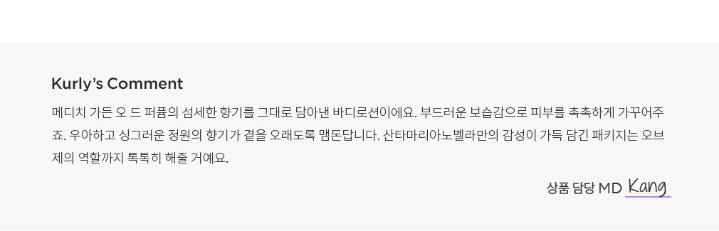 메디치 가든 컬렉션 신비로운 영감으로 가득한 메디치 가문의 정원에서 영감을 받은 바디 컬렉션을 소개할게요. 피렌체의 문화와 예술이 가장 번영하던 시절, 메디치 가문의 다채로운 이야기와 소중한 기억을 담아냈어요. 오랜 시간 메디치 가문의 정원을 지켜온 매그놀리아부터 비밀 온실에 숨겨왔던 자스민까지. 각각의 향기 뒤에 숨겨진 오랜 이야기를 만나보세요.