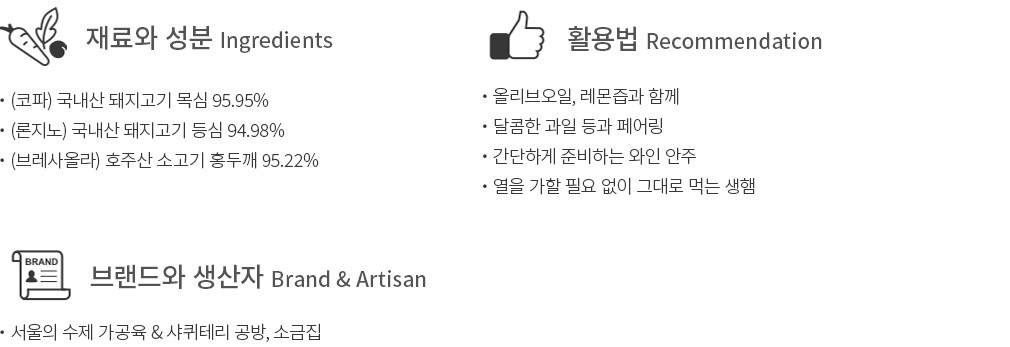 소금집은 고기와 소금, 그리고 시간을 주재료로 수제 가공육을 만드는 공방이에요. 모든 과정에서 사람의 손길이 깃든 샤퀴테리를 선보이고 있지요. 이번에는 코파와 브레사올라, 론지노를 함께 담았어요. 사르르 녹는 지방의 식감, 짭조름한 맛, 짙어진 육향까지. 소금집이 선사하는 특별한 미식 경험, 이제 집에서 편안하게 누려보세요.