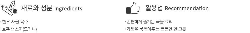 조리법 ・냉장고에 두고 3~5시간 동안 해동하거나 상온에서 1시간 동안 해동한 뒤, 냄비에 내용물을 붓고 팔팔 끓여주세요.