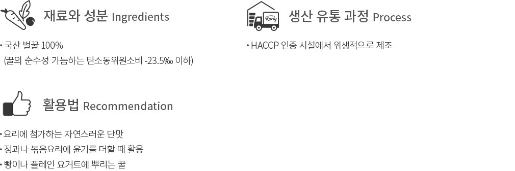 ・꿀 특성상, 포도당과 과당의 함량에 따라 벌꿀이 하얗게 굳어질 수 있어요. 이는 자연스럽게 생기는 결정 현상이니, 안심하고 섭취하세요.
