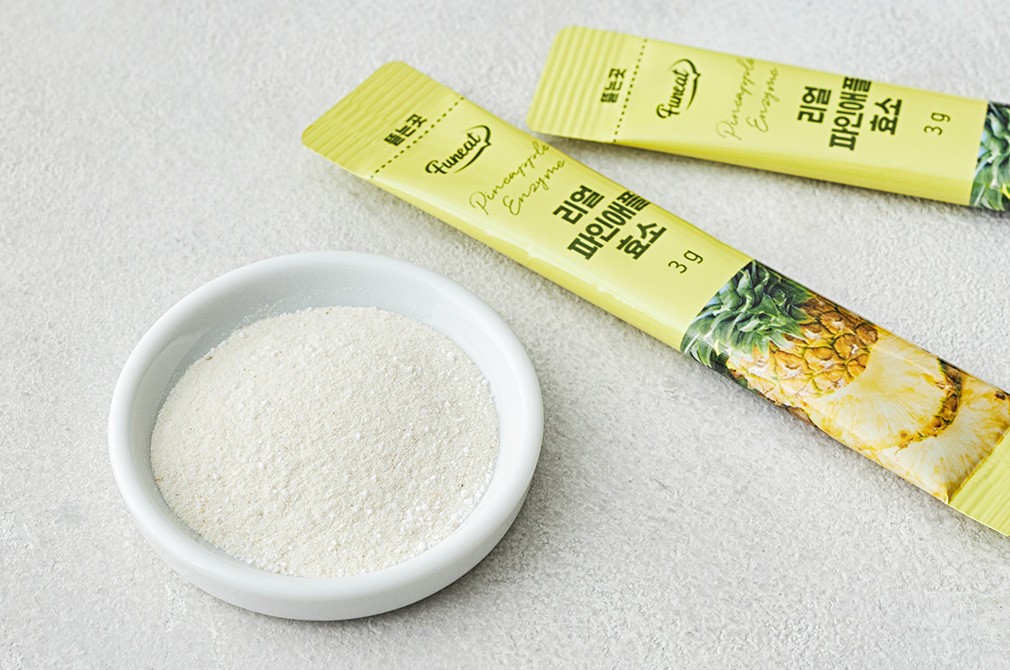 단백질을 분해하는 ‘브로멜라인’을 풍부하게 함유하고 있어 연육에도 자주 사용되곤 하는 파인애플. 이 천연 단백질 분해 성분을 효소에 적용한 퍼니트의 제품을 만나보세요. 진짜 파인애플을 통째로 갈아 넣은 농축·추출 분말을 사용했답니다. 하루 한 포씩, 간편하고 맛있게 섭취해 보세요.