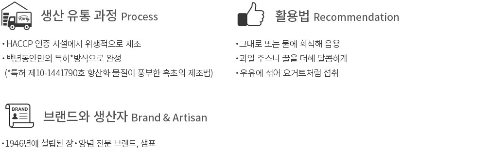 ・특징 : 산수유와 석류, 다크스위트체리, 사과 농축액을 더해 완성한 흑초입니다.