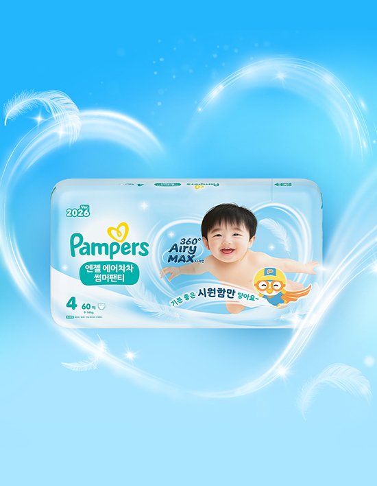 글로벌 1위 기저귀 브랜드, 팸퍼스 에어차차 썸머팬티, 기저귀 탑시트 온도 -3도 여름철 피부자극 걱정 굿바이! 1. 땀띠 걱정 굿바이! 2. 숨쉬는 엉덩이! 3. 보송보송한 흡수력! 4. 가벼운 움직임!