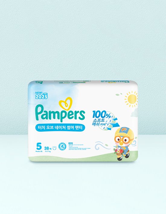 글로벌 1위 기저귀 브랜드, 팸퍼스 터치 오브 네이처 썸머, 연약한 아이 피부도 여름철 피부 자극 걱정 굿바이~! 1. 기저귀 탑시트 온도 -3도 2. 약 2만개의 에어홀로 공기 솔솔! 3. 업그레이드된 부드러움