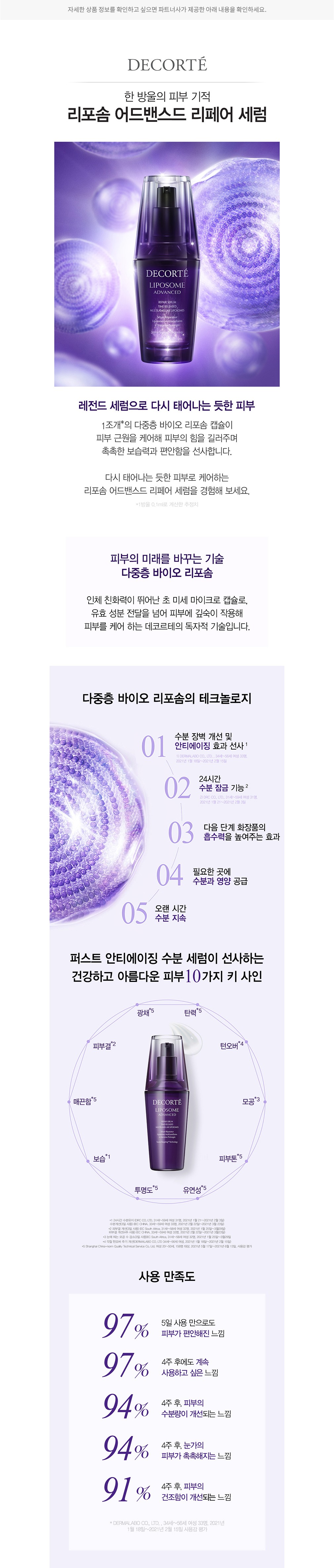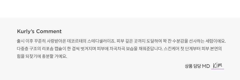 한 방울의 피부 기적, 리포솜 라인 데코르테의 대표 안티에이징 · 수분케어 라인입니다. 독자적인 다중층 바이오 리포솜 기술을 적용한 것이 특징인데요. 인체 친화력이 뛰어난 초미세 마이크로 캡슐이 유효 성분 전달을 넘어, 피부 깊숙이 작용해 수분감과 영양감을 지속시켜주죠. 끊임없는 연구와 첨단 바이오 기술로 완성한 ‘한 방울의 피부 기적’을 경험해 보세요.