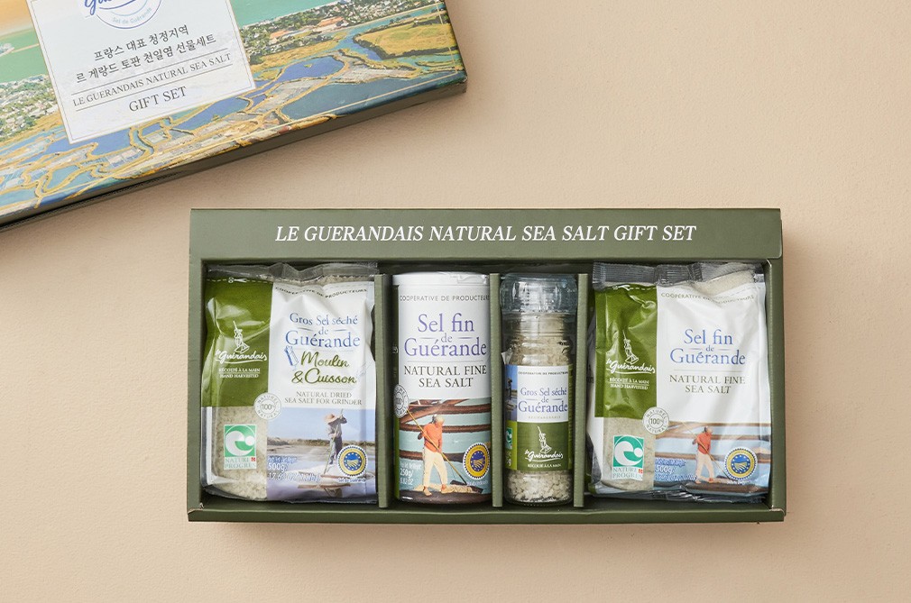 프랑스 게랑드 지방의 풍부한 햇살과 바람이 만들어 낸 소금, 르 게랑드의 토판 천일염을 소개합니다. 토판염은 바닷물을 갯벌에 가둬 햇빛에 증발시키는 가장 자연적인 방식으로 만드는 소금이에요. 이렇게 생산된 토판염은 쓴 맛 없이 짭짤하면서도 특유의 달콤한 감칠맛을 지녔답니다. 어떤 요리든 부드럽게 녹아드는 가는 소금과 그라인더에 넣어 갈아 쓰기 좋은 굵은 소금을 함께 보내드려요. 감사한 분들께 마음을 전하는 선물로 선택해 보세요.