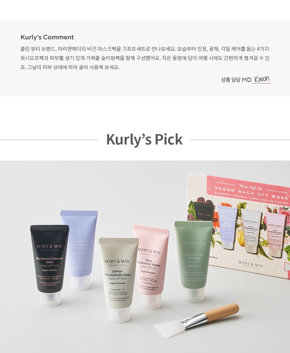 비건 워시오프 마스크 미니 5종 기프트세트 ・ 구성 : ①비건 로즈 히알루로닉 하이드라 워시오프팩, ②비건 시카 티트리 수딩 워시오프팩, ③비건 레몬 나이아신아마이드 글로우 워시오프팩, ④비건 블랙베리 콤플렉스 글로우 워시오프팩, ⑤비건 카렌듈라 펩타이드 에이지리스 슬리핑 마스크, ⑥실리콘 브러쉬