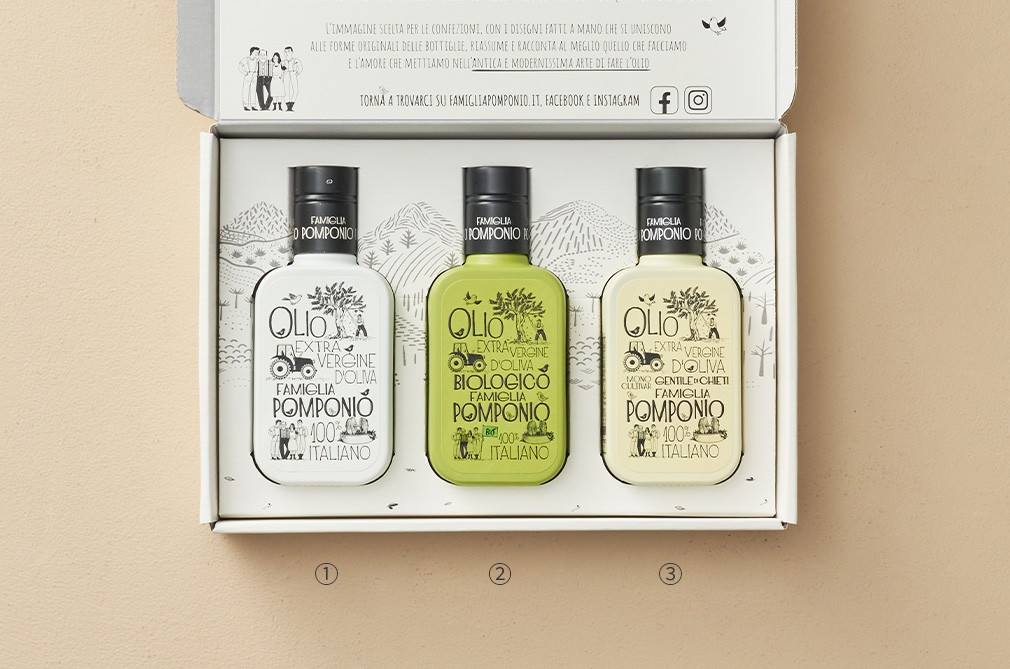 폼포니오 엑스트라 버진 올리브오일 3종 세트 ・ 구성 : ①엑스트라 버진 올리브오일, ②오가닉 엑스트라 버진 올리브오일, ③엑스트라 버진 올리브오일 모노컬티바 (젠텔레 디 키에티)