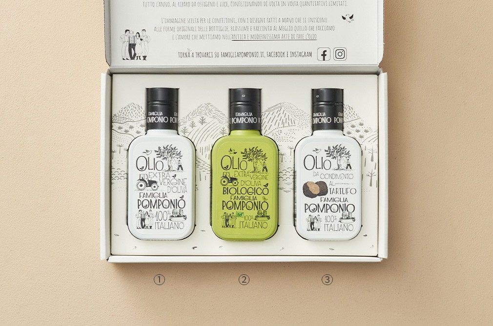 선물세트 폼포니오 플레이버 올리브 오일 3종 세트 ・ 구성 : ①엑스트라 버진 올리브오일, ②오가닉 엑스트라 버진 올리브오일, ③엑스트라 버진 트러플 올리브오일