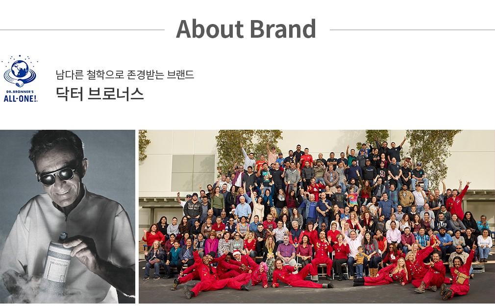 미국으로 이민 간 닥터 브로너는 캘리포니아에 자신의 이름을 건 닥터 브로너스 매직 솝(Dr.Bronner's Magic Soap)을 오픈하고, 사업을 키워 나갔습니다. 제2차 세계 대전의 폭력성을 목격한 그는 세계 평화를 외치는 ALL-ONE 운동을 벌이기도 했답니다. 'ALL-ONE!'은 닥터 브로너스의 슬로건이기도 해요. 양심을 지키며 좋은 재료로, 동물과 환경까지 생각한 제품을 선보이는 닥터 브로너스. 100년 넘게 바른길만 걸어온 닥터 브로너스의 열정은 제품 하나하나에 녹아들어 있어요.