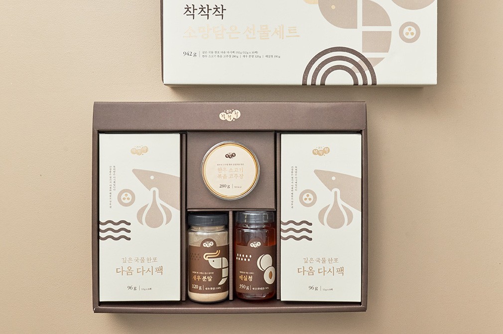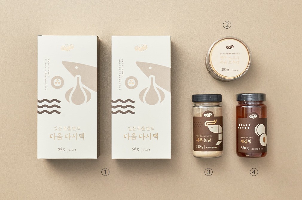 소망담은 세트 ・ 구성 : ①다옴 다시팩, ②한우 소고기 볶음 고추장, ③새우 분말, ④매실청