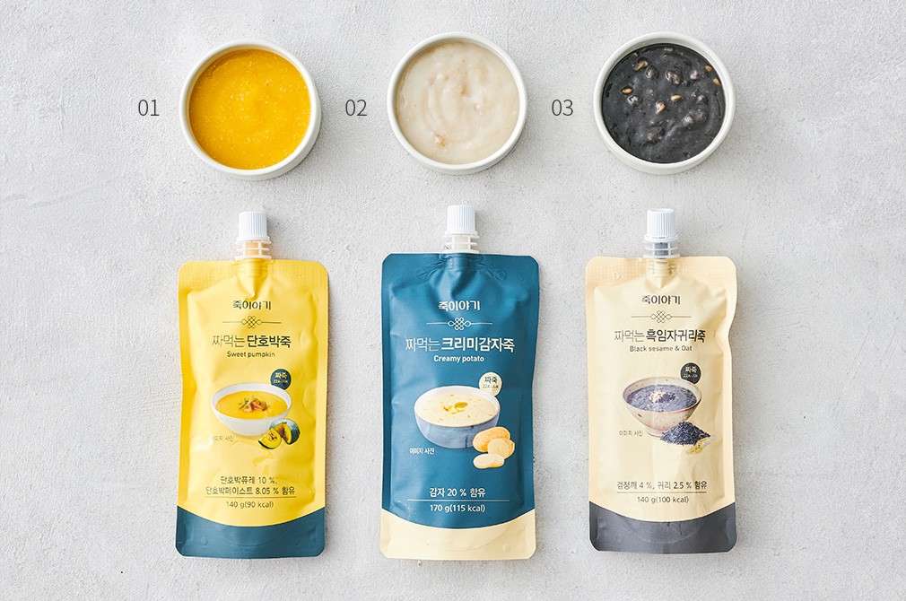 언제 어디서든 간편하게 즐길 수 있는 죽이야기의 짜먹는 죽을 소개할게요. 뚜껑이 달린 파우치에 한 번에 먹기 좋은 양만큼 담았답니다. 따로 데울 필요 없이 바로 먹을 수 있는 것은 물론이고요. 외출 시 하나씩 챙기기도 좋아요. 단호박, 감자 등 6가지 종류를 준비했으니 취향에 따라 골라보세요.
