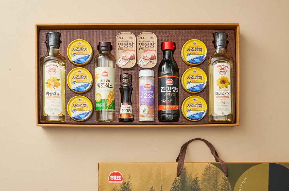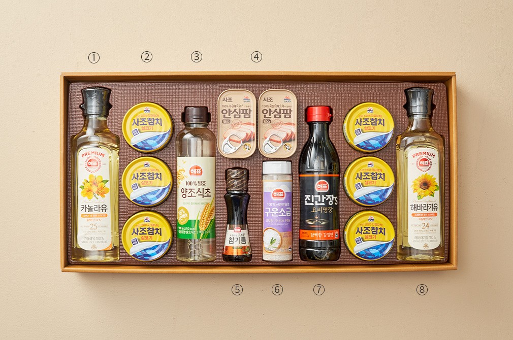 안심특선 OA호 ・ 구성 : ①해표 카놀라유, ②사조 안심따개 살코기 참치, ③양조식초, ④사조 안심팜, ⑤참기름, ⑥구운소금, ⑦해표 진간장S, ⑧해표 해바라기유