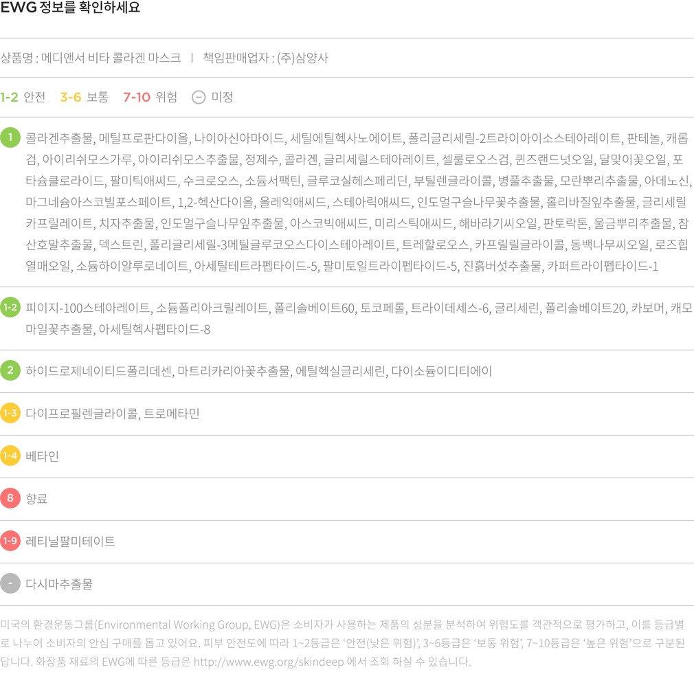 ・ 특징 : 500Da 콜라겐추출물과 비타민 성분이 함유된 마스크 팩이에요. 미백, 주름개선에 도움을 주는 기능성 제품입니다.