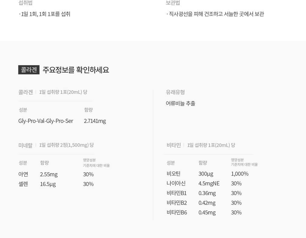 기능 정보 ・[피쉬콜라겐 펩타이드] 자외선에 의한 피부 손상으로부터 피부 건강을 유지하는 데 도움을 줄 수 있음, 피부 보습에 도움을 줄 수 있음