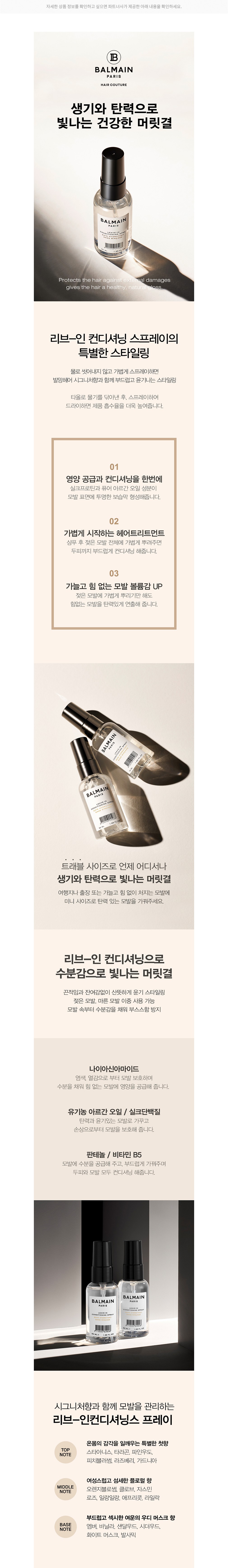 사용법 ・ 샴푸 후 젖은 모발에 10~20cm 정도 거리를 두고 골고루 분사한 후, 드라이해주세요.