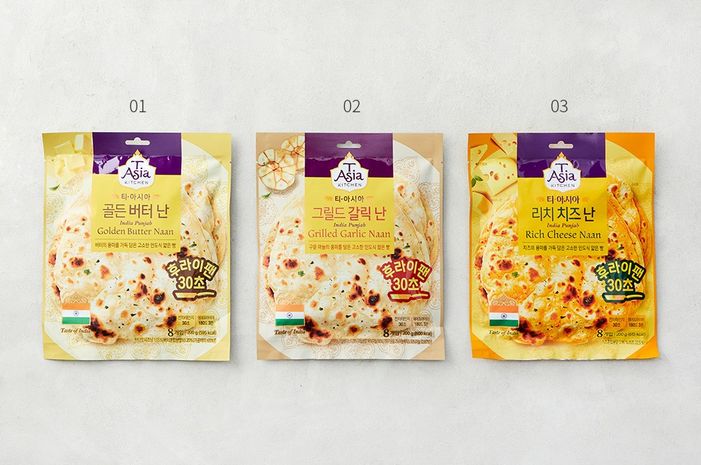 아시안 푸드 전문 브랜드인 티아시아에서 인도식 난 3종을 선보입니다. 반죽을 여러 번 치댄 후, 숙성 및 발효 과정을 거쳐 부드러우면서도 쫄깃한 식감을 완성했지요. 3가지 종류를 준비했으니 취향에 따라 골라보세요. 프라이팬이나 전자레인지 등으로 잠깐 데워서, 화덕에서 갓 구운 듯 따뜻하고 고소한 난을 간편하게 즐길 수 있을 거예요.