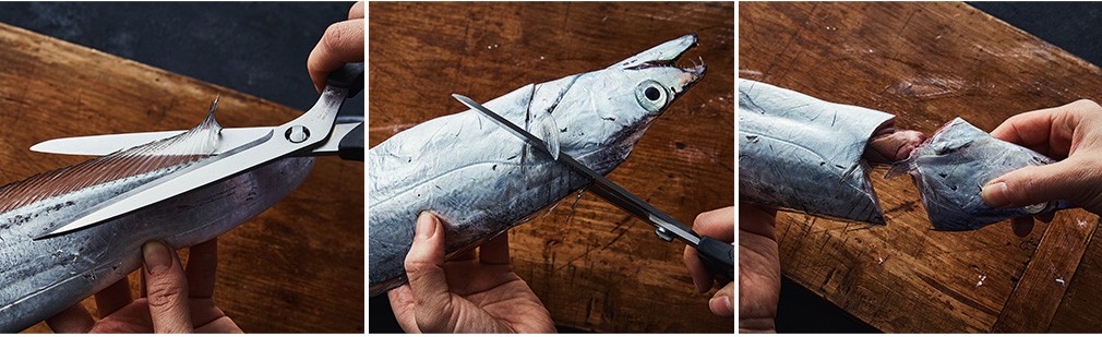 손질법 1. 갈치의 머리와 꼬리, 등 지느러미를 잘라주세요. 가위를 쓰시면 한결 간편합니다.