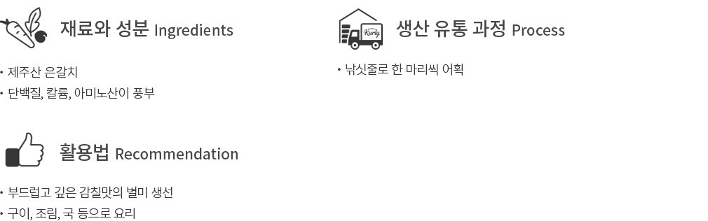활용팁 ・갈치 구이 : 굵은 소금으로 밑간을 하고 채반 위에 10분간 두세요. 기름을 두른 팬에 약불에서 앞뒤로 고루 구워주세요. 프라이팬 대신 오븐을 사용해도 좋아요.