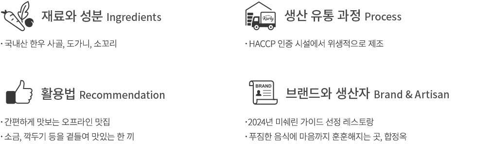 맛있게 드시는 법 ・슴슴하고 담백하게 완성해 살짝 싱겁게 느껴질 수 있어요. 기호에 따라 소금, 깍두기 등을 곁들여 간을 더하거나 대파를 추가해 더욱 풍성하게 즐겨보세요.