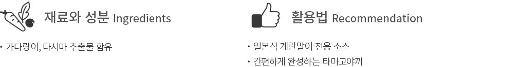 활용법 ・계란 2개에 소스 1큰술을 넣고 잘 섞어준 후, 프라이팬에 계란 물을 넣고 약불에서 천천히 조리해 주세요.