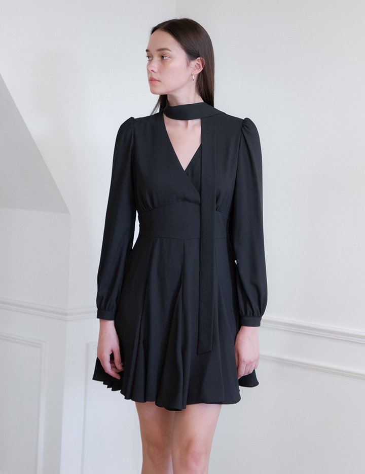 [벰버] 타이 칼라 플레어 원피스_블랙