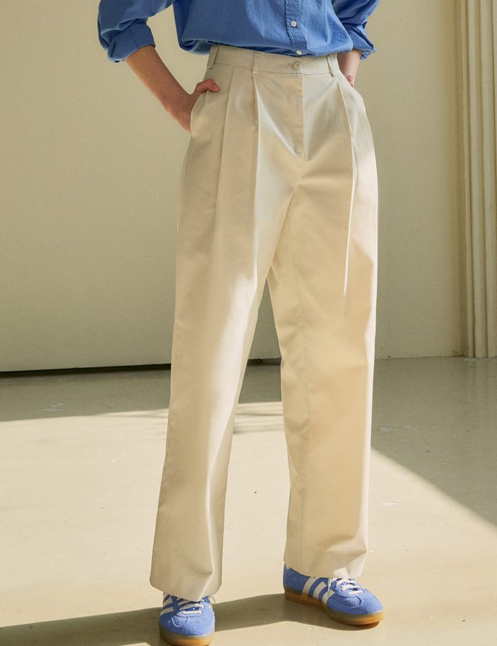 편안하게 착용할 수 있는 와이드 팬츠입니다. 전면부에 두 개의 턱을 잡아 여유 있는 실루엣을 연출하였으며, 허리 사이즈를 조절할 수 있도록 디자인했습니다.