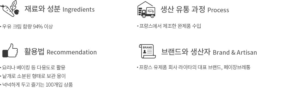 페이장브레통은 버터부터 부드러운 크림치즈, 특산치즈, 크레페, 우유버터 등 대부분 낙농업에 기초한 제품들을 만드는 브랜드입니다. '마담로익' 치즈를 생산하는 프랑스 유제품 기업, '라이타'의 대표 브랜드이기도 하죠. 페이장브레통은 세대를 걸쳐 전해져 내려온 레시피에 따라 특유의 풍미와 부드러운 텍스처, 엄성된 성분으로 제품을 만들어내고 있습니다. 특히 전문가와 소비자 배심원들을 대상으로 정기적엔 맛 테스트를 진행, 품질 유지에 힘쓰고 있어요.