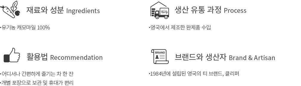 영국에서 사랑받는 티 브랜드, 클리퍼의 유기농 캐모마일을 소개할게요. 꼼꼼히 엄선한 유기농 캐모마일만을 사용하여 캐모마일 본연의 향긋하고 부드러운 매력을 고스란히 담아냈답니다. 따뜻한 물에 우려서 자기 전에 한 잔씩 드셔 보세요. 늦은 밤에 마셔도 편안할 거예요.