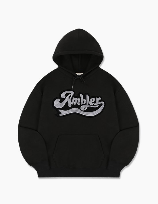 엠블러의 레터링 빅로고가 고밀도 자수로 표현되어 높은 퀄리티를 보여주는 데일리 오버핏 후드티