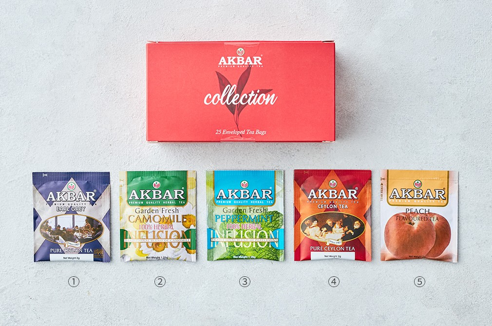 컬렉션 ・구성 : ①얼그레이 홍차, ②캐모마일 허브차, ③페퍼민트 허브차, ④실론 홍차. ⑤복숭아향 홍차
