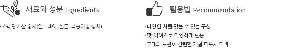 ・특징 : 스리랑카산 홍차에 얼그레이향을 더해 완성했어요. 상큼하면서도 진한 향미가 돋보입니다.