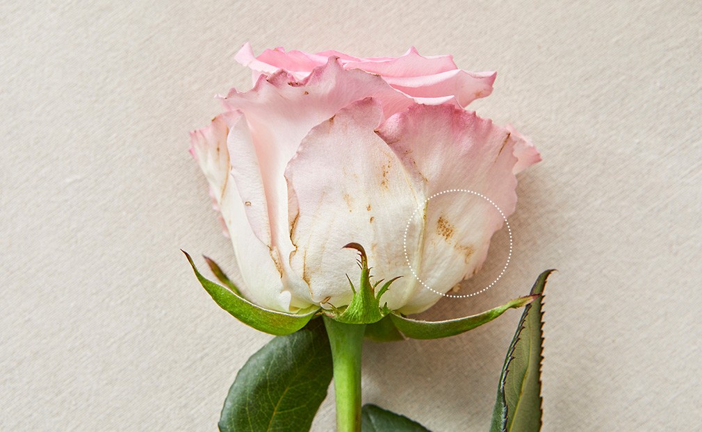 다소 투박해 보일 수 있어요 ・바깥쪽 꽃잎이 둔탁한 색으로 바래 보이거나, 가시로 인해 상처가 날 수 있어요. 얇은 꽃잎을 보호하기 위해 거친 떡잎을 그대로 보존한 장미의 특성이에요. 깨끗한 꽃잎만을 감상하고 싶다면, 꽃이 어느 정도 피어난 후 제거해도 무방합니다.