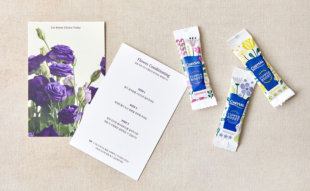 싱싱하게 유지해 보세요 ・꽃의 수명 연장에 도움을 주는 플라워 푸드가 동봉됩니다. 장식하는 데 필요한 손질용 도구, 포장지, 꽃병 등은 별도로 준비해주세요.