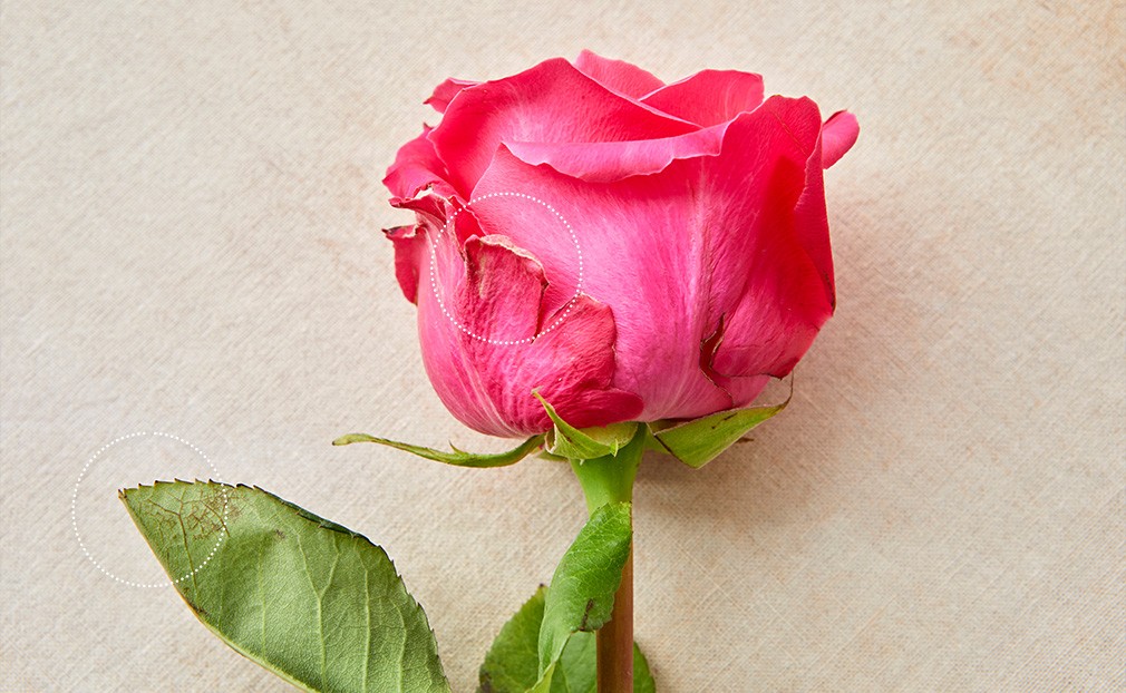 다소 투박해 보일 수 있어요 ・바깥쪽 꽃잎이 둔탁한 색으로 바래 보이거나, 가시로 인해 상처가 날 수 있어요. 얇은 꽃잎을 보호하기 위해 거친 떡잎을 그대로 보존한 장미의 특성이에요. 깨끗한 꽃잎만을 감상하고 싶다면, 꽃이 어느 정도 피어난 후 제거해도 무방합니다.