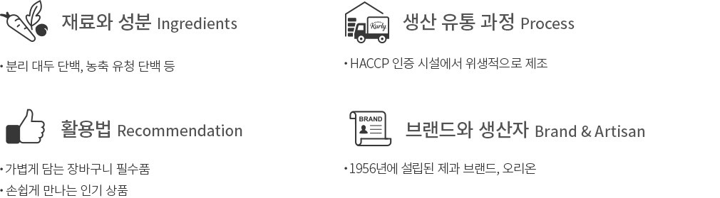 - 우유, 대두, 쇠고기, 땅콩 함유 - 밀, 달걀, 호두, 복숭아, 토마토, 돼지고기, 쇠고기, 닭고기, 오징어, 새우, 게, 조개류(굴, 홍합) 혼입가능
