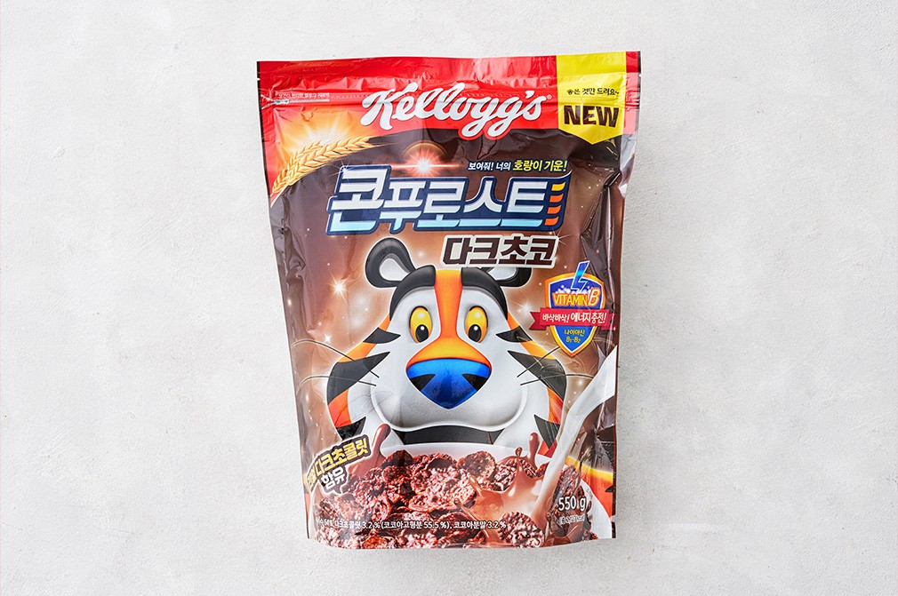 바쁜 아침, 간단하게 먹기 좋은 켈로그의 콘푸로스트 다크초코를 소개할게요. 다크초콜릿과 코코아분말로 만들어 진한 초코 향이 느껴져요. 지퍼백에 담겨 있어 남은 시리얼을 깔끔하게 보관하기 좋답니다. 흰 우유나 요거트에 곁들여 즐겨 보세요.