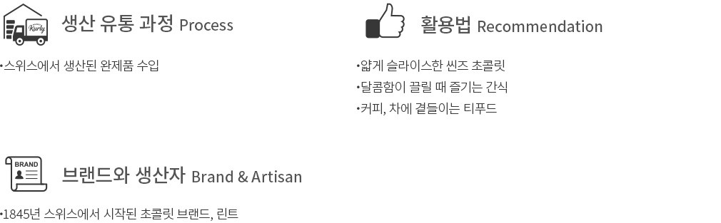 ・특징 : 밀크의 부드러움과 달콤함이 풍부하게 느껴지는 초콜릿이에요. 깊고 진한 한 조각을 커피나 티에 곁들여 보세요.