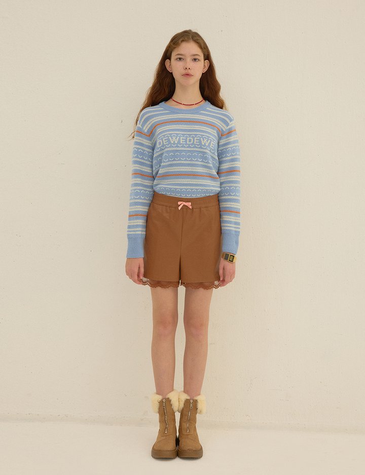 레더소재로 제작한 쇼츠아이템입니다. 허리밴딩에 컬러 리본이 포인트이며, 하단은 레이스 디테일로 마무리되었습니다.