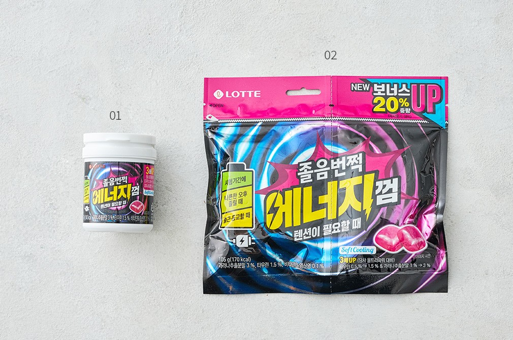 01~02. 졸음번쩍껌 에너지 ・선택 가이드 : ①1통(87g), ②1봉(105g) 중에서 선택하세요.