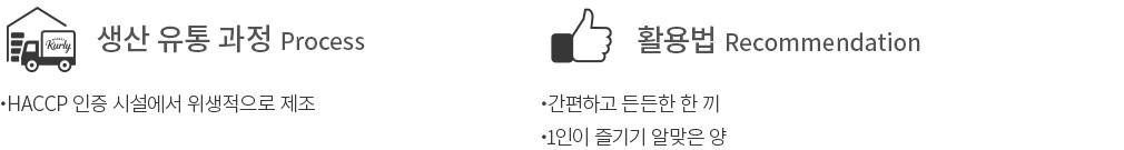 데우는 법 ・전자레인지 조리 시 : 포장을 살짝 뜯은 다음, 전자레인지에 봉지째로 세워서 넣고 약 2분간 데워 드세요. (700W 기준)